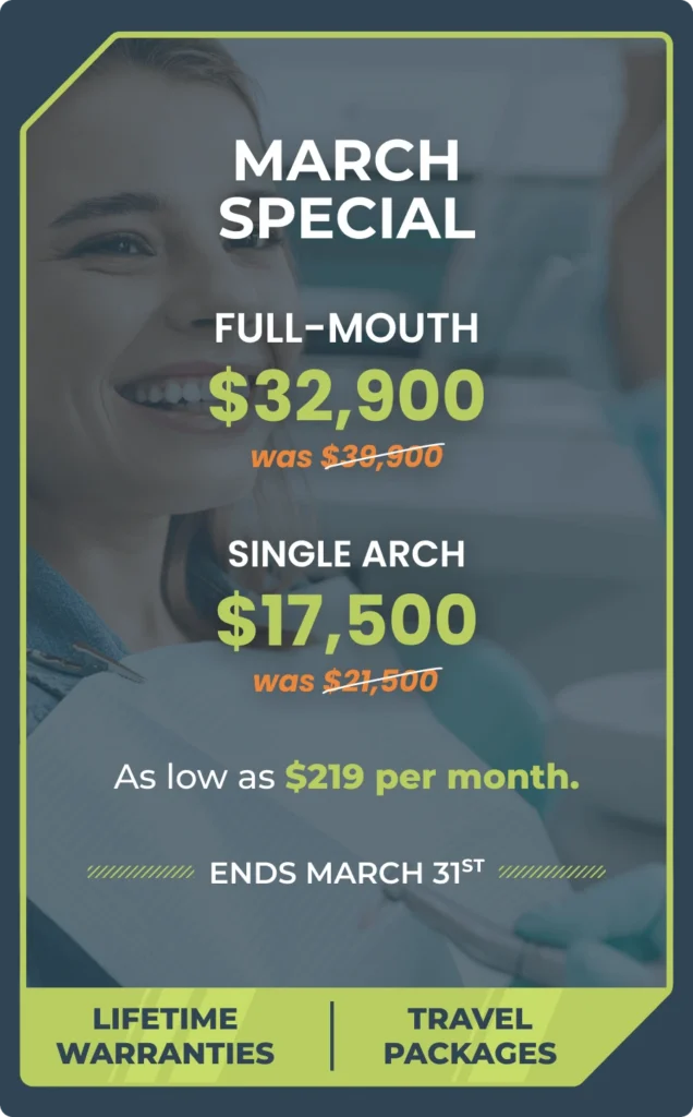 Until March 31, Done In One is offering special pricing on single and double zirconia arches (upper, lower, or both). Call today to schedule your free consultation and take advantage of this special offer.