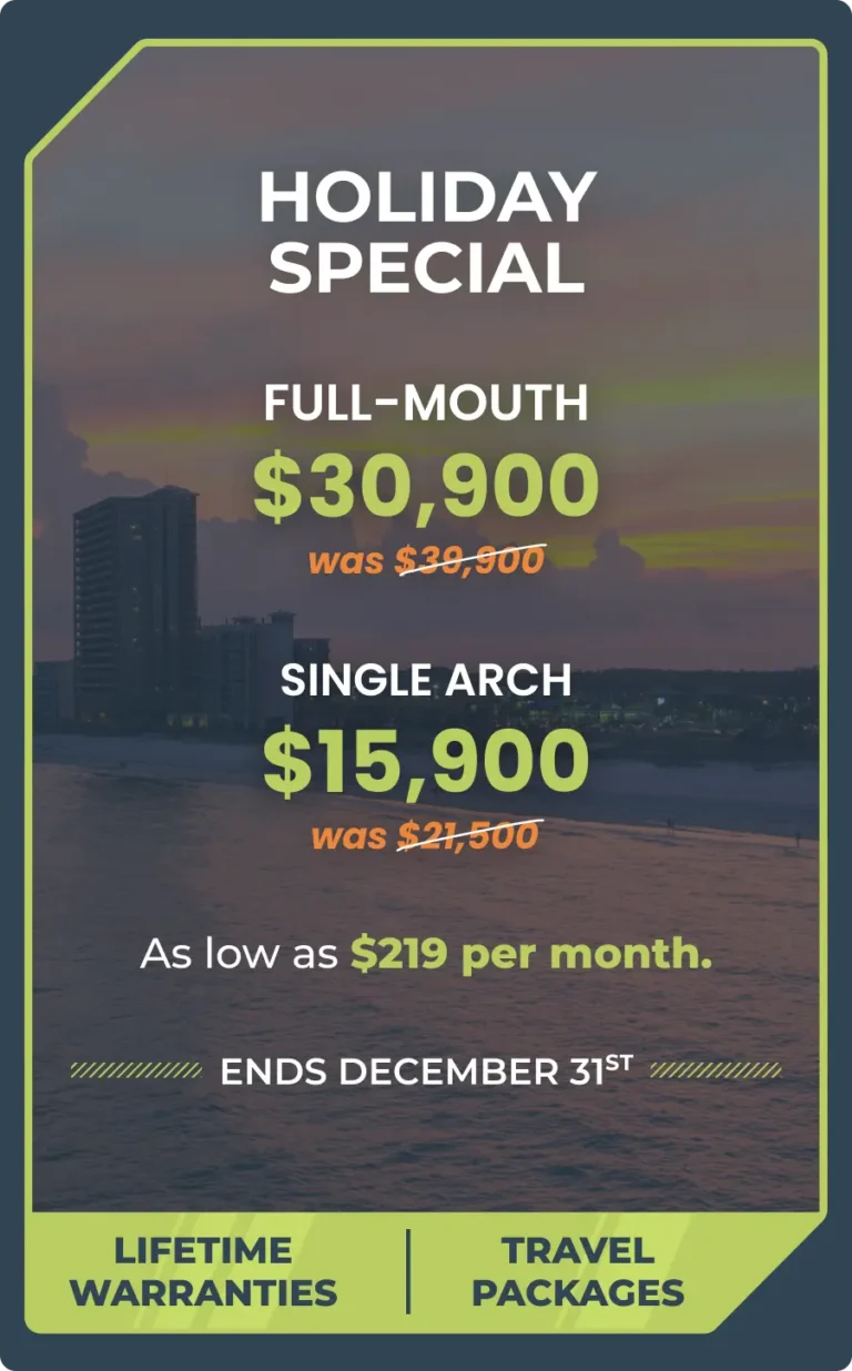 Until December 31st, Done In One is offering special pricing on single and double zirconia arches (upper, lower, or both). Call today to schedule your free consultation and take advantage of this special offer.